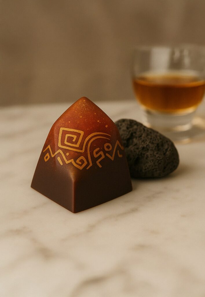 Este bombón lleva chapulines caramelizados con mezcal, y sí: es toda una aventura en la boca. Crujiente, ahumado, ligeramente dulce, es el tipo de sabor que no se olvida. Ch’ujuk significa “dulce” en maya, y este bombón honra esa dualidad de lo salvaje con lo suave.
